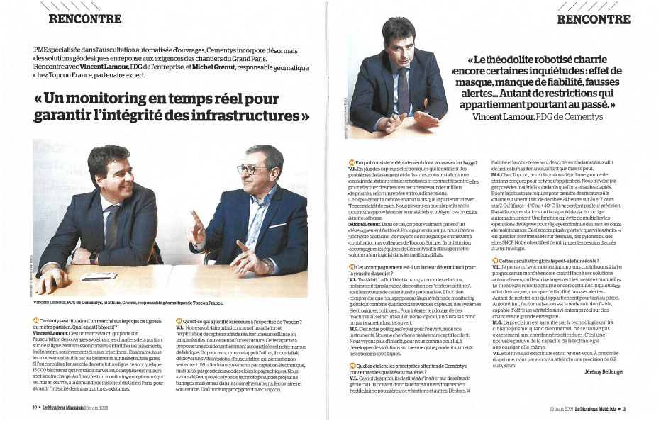 Partenariat Cementys/Topcon en auscultation automatisée sur le Grand Paris Découvrez l’article paru dans le Moniteur Matériel N°5967 au sujet du partenariat entre Cementys et Topcon sur le projet du Grand Paris Express Cliquez sur l'image ci-dessous pour découvrir l'article Autres anecdotes Traitement de données de masse : Topcon annonce de nouvelles... En savoir plus Topcon annonce la sortie d’une solution de surveillance des déformations En savoir plus Topcon annonce le perfectionnement des kits UAS. En savoir plus