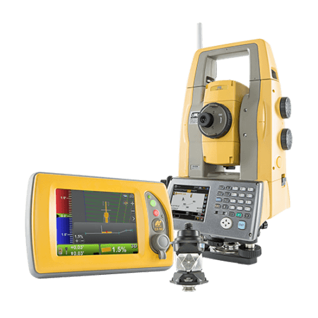 Une station totale de topographie standard mesure en permanence la position du bulldozer, de la niveleuse ou du finisseur et envoie les informations au boîtier de commande de l'opérateur, qui peut ainsi commander automatiquement en 3D la lame et la table.
