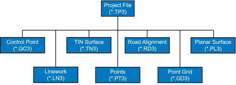 Chaque type de données se comporte comme un dossier. Il existe un dossier destiné aux surfaces TIN, un autre destiné aux points, un autre destiné aux dessins au trait, etc. Ces dossiers sont enregistrés dans le « boîtier de données », le fichier TP3.