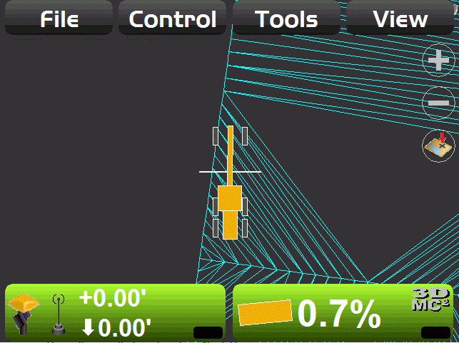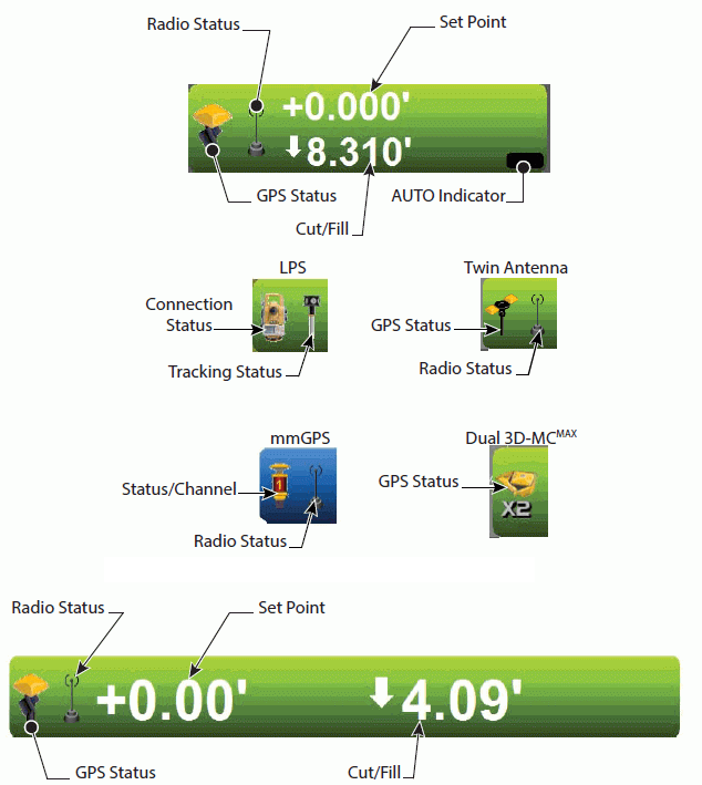- The Elevation Control Button displays the cut/fill readings and the cut/fill offsets for the elevation of the blade or implement.