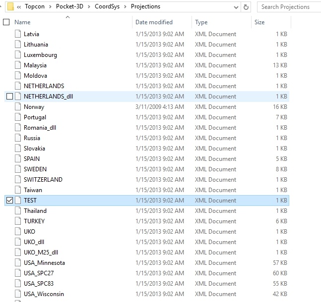 • On a data collector, the directory is My Device > Program FIles > Topcon > Pocket3D > CoordSys > Projections.