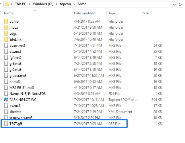 • On a data collector, the directory is My Device > TOPCON > 3DMC.