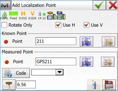 • Select the measure button in bottom-right to record GNSS values for the control point