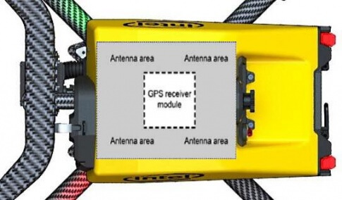The GPS receiver module of the Intel® Falcon™ 8+ Drone - Topcon Edition is placed directly underneath the canopy of the central unit and is surrounded by an antenna. The canopy of the Intel® Falcon™ 8+ Drone - Topcon Edition is made from a material which does not influence the satellite signals, but anything on the top of the Intel® Falcon™ 8+ Drone - Topcon Edition can potentially disturb the signal. Never cover the GPS receiver module nor the antenna area